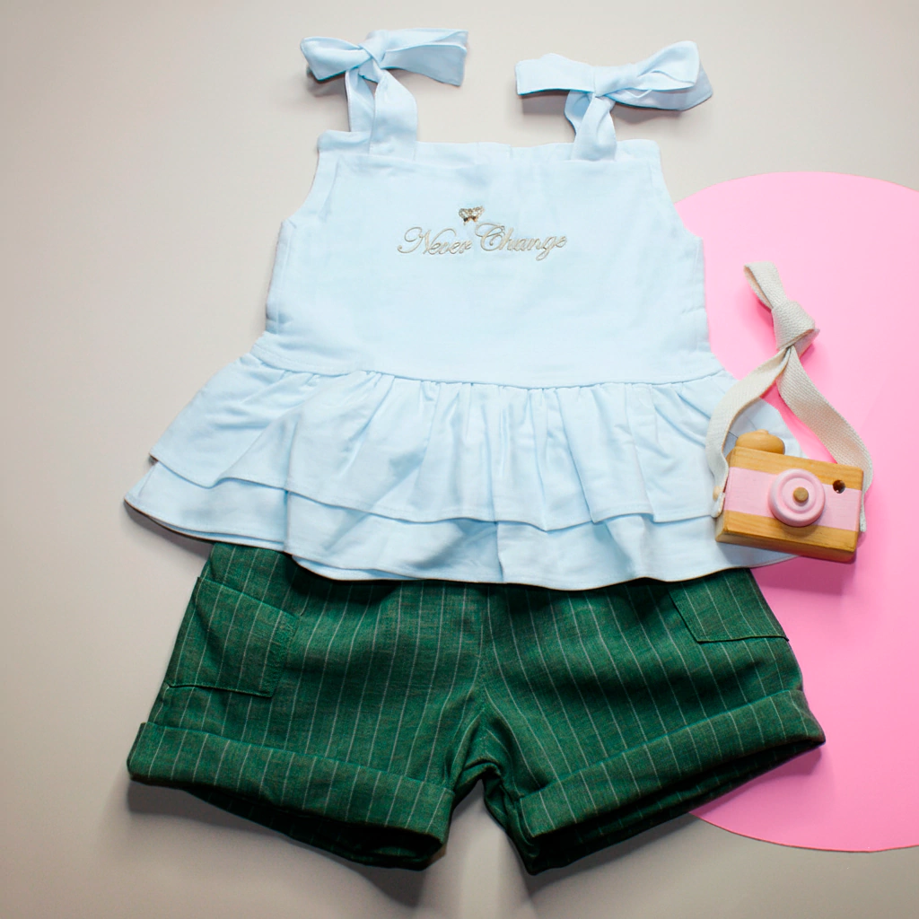Prepara a tu pequeña para los días de sol con nuestro encantador Conjunto "Never Change", ideal para un look fresco y elegante. La blusa con tirantes de lazo y volantes escalonados, adornada con el delicado bordado "Never Change", se combina perfectamente con un short con el bajo doblado y textura de rayas finas. Puedes elegir entre tres tonos sofisticados para el short: verde esmeralda, rosa palo y azul marino, todos ellos creando un contraste chic con la blusa celeste. Este diseño exclusivo es perfecto para cualquier aventura veraniega y lo encuentras disponible en tallas desde la 4 hasta la 16, asegurando comodidad y estilo para cada ocasión.